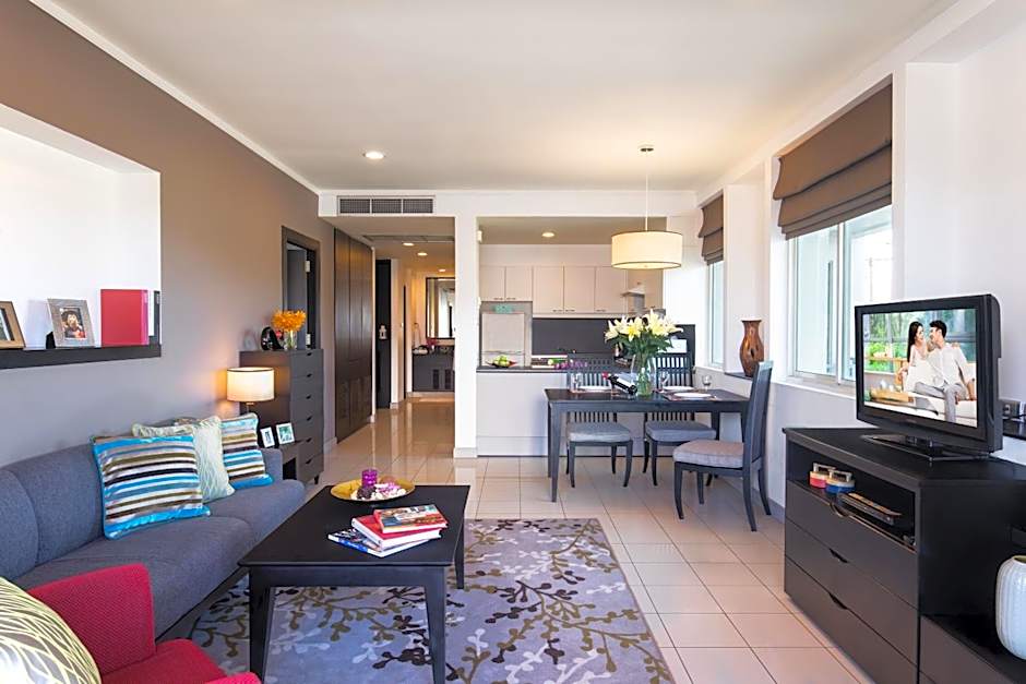 This apartment features a seating area, microwave and a city view.